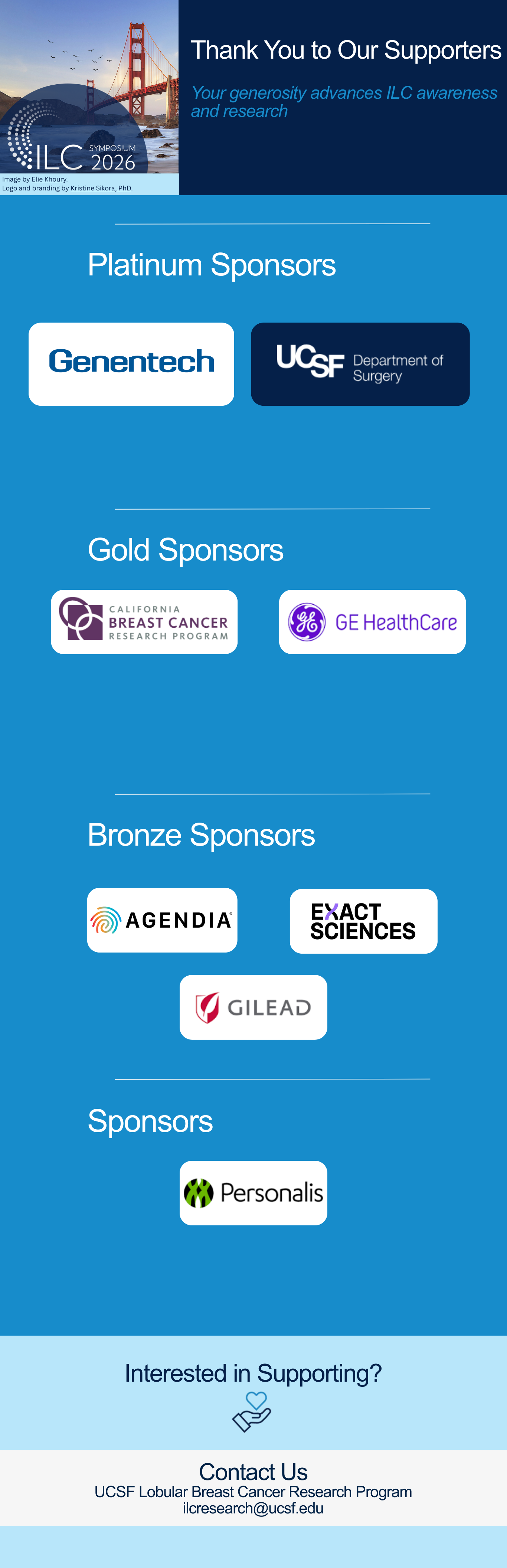 Add to Calendar International Invasive Lobular Carcinoma Symposium 9/23/2026 7:00:00 AM 9/25/2026 7:00:00 PM America/Los_Angeles For More Details: https://ucsf.cloud-cme.com/ilcsymposium2026 Description: The International Invasive Lobular Carcinoma Symposium is the premier scientific and clinical meeting focused on lobular breast cancer. International experts, clinicians, scientists, and patient advocates convene to review the latest updates and research on lobular breast cancer.AbstractsCall for AbstractsSubmissions are now openDeadline: May 15, 2026 11:59 PM PSTSubmit Your Abstract Today*Link opens to Oxford Abstrac... Hyatt Regency San Francisco false MM/DD/YYYY